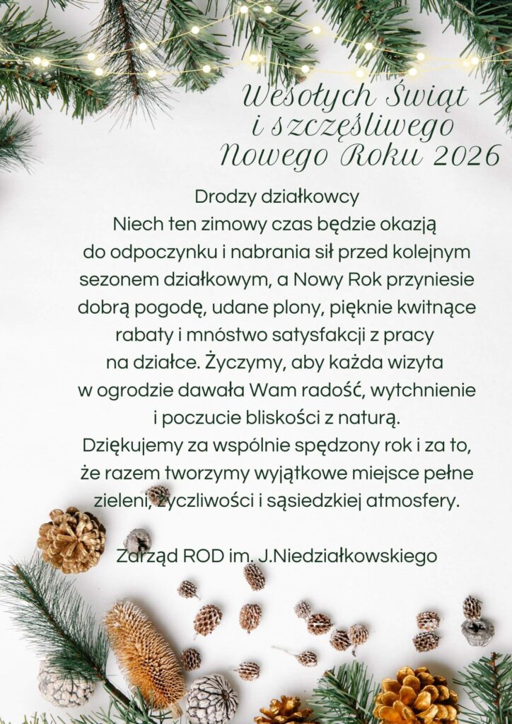 Wesołych Świąt ! 22 grudnia 2025 Pozostałe aktualnościJesteśmy na facebookuKomunikat dotyczący napełniania instalacji wody miejskiejUchwały z posiedzenia Zarządu ROD im. J. Niedziałkowskiego z dnia 06.05.2024 Bez kategorii