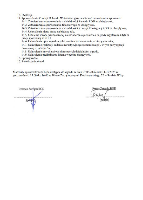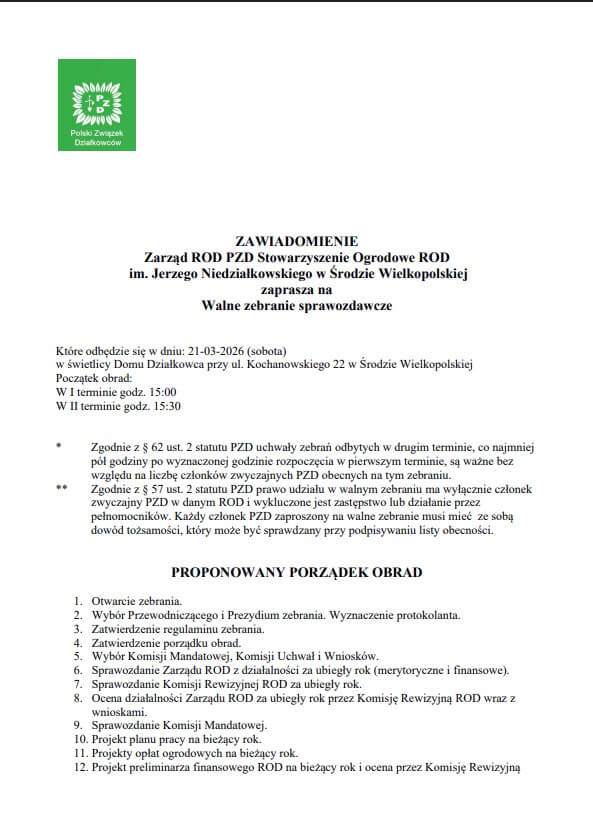 Drodzy działkowcy, zapraszamy na coroczne Walne Zebranie, które odbędzie się w pierwszy dzień wiosny, czyli 21 marca, oczywiście w Domu Działkowca. Mając nadzieję na większą frekwencję, zarząd zmienił tradycyjną porę walnych zebrań ( niedziela przed południem) na SOBOTĘ w godzinach popołudniowych – 15.00. Szczegóły znajdziecie w poniższym zawiadomieniu.